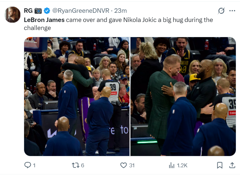 比赛结束后约基奇与詹姆斯也紧紧相拥,约基奇祝贺老詹拿到胜利,老詹祝贺约基奇入选全明星先发,超巨都是惺惺相惜。
