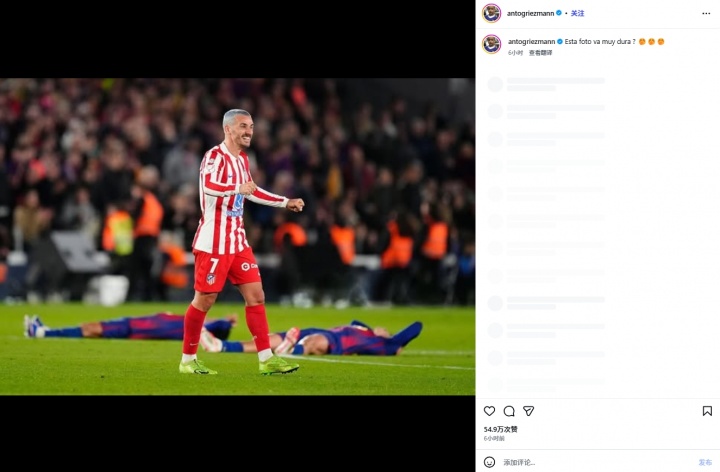 赛后格列兹曼晒出庆祝照,背景是出局后瘫倒的巴萨球员。格列兹曼同时写道:“这张照片太狠了?”